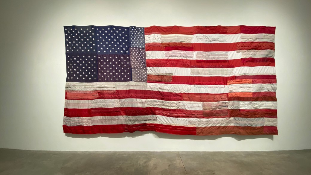 This piece consists of almost 40 decommissioned US flags. The one inconsistency in the flag is the number of stars. There are 332 stars in this flag representing the 332 million Americans. In other words, my 320 million neighbors. I want to do my part to mend what has been torn, to bring together what has been separated. I want this piece to make the viewer ponder whether they are helping tear their community apart or helping mend it back together.