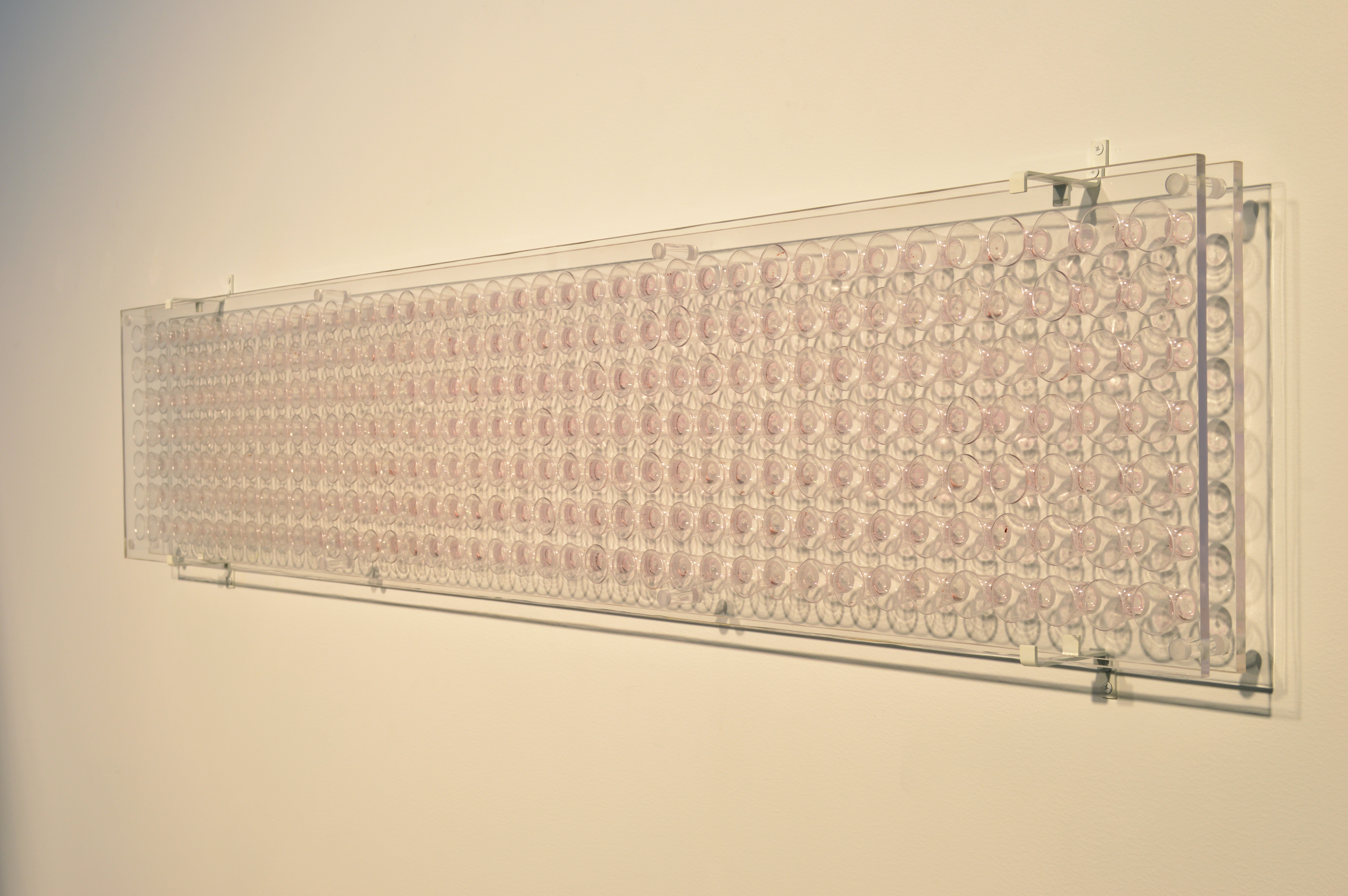 Published January 5, 2016 at 6016 × 4000 in Sculpture ← Previous Next → Looking at Life Through Rose-Colored Glasses (2015) 63″ x 3″ x 12″ Used Communion Cups, acrylic glass