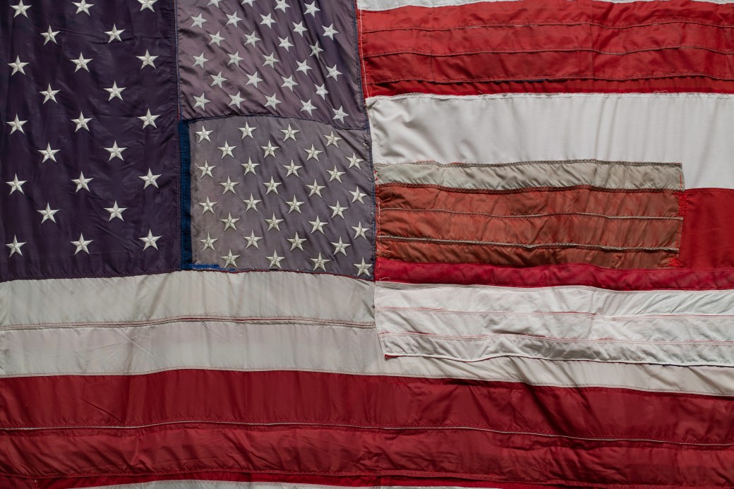 This piece consists of almost 40 decommissioned US flags. The one inconsistency in the flag is the number of stars. There are 332 stars in this flag representing the 332 million Americans. In other words, my 320 million neighbors. I want to do my part to mend what has been torn, to bring together what has been separated. I want this piece to make the viewer ponder whether they are helping tear their community apart or helping mend it back together.