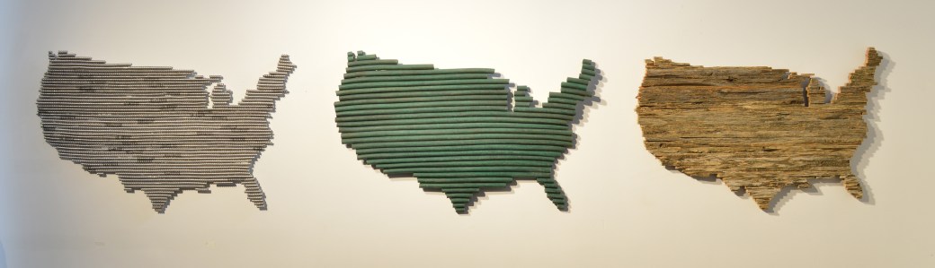 Published June 26, 2015 at 3271 × 941 in Sculpture ← Previous Next → The Abundant State (2015) | 26″ x 46″ x 1″ ea. | Conduit, water hose, wood