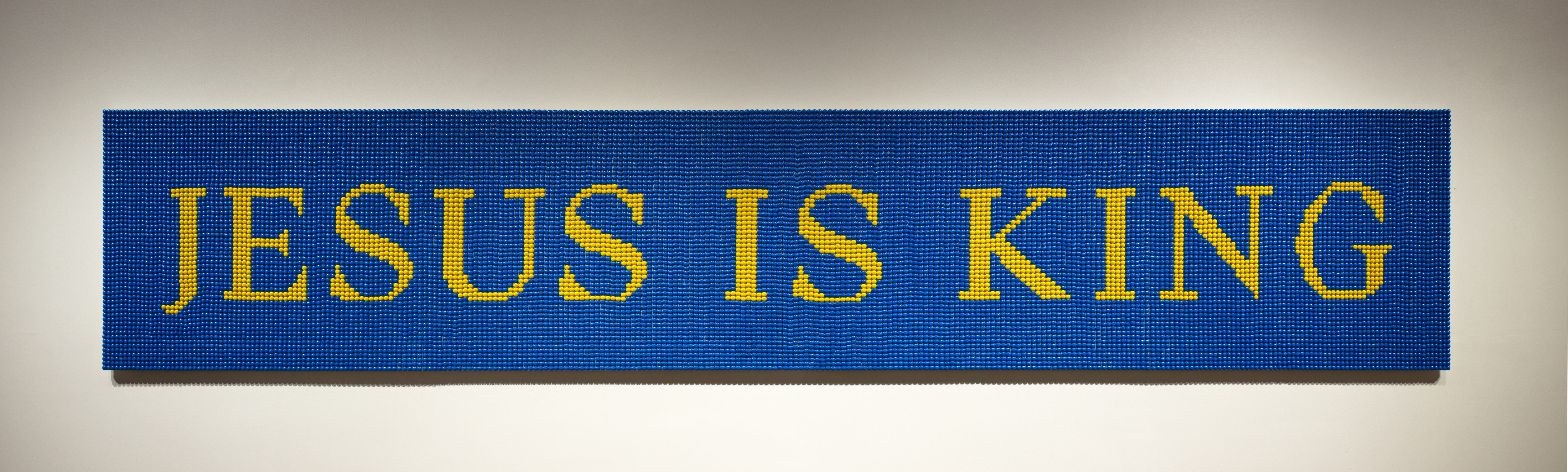 Made entirely of M&Ms (almost 8lbs worth, about 20,000). This piece contrasts Kim saying M&M’s will change your life while her husband Kanye West recently produced an album titled ‘Jesus Is King,’ which proclaims Jesus will change your life.