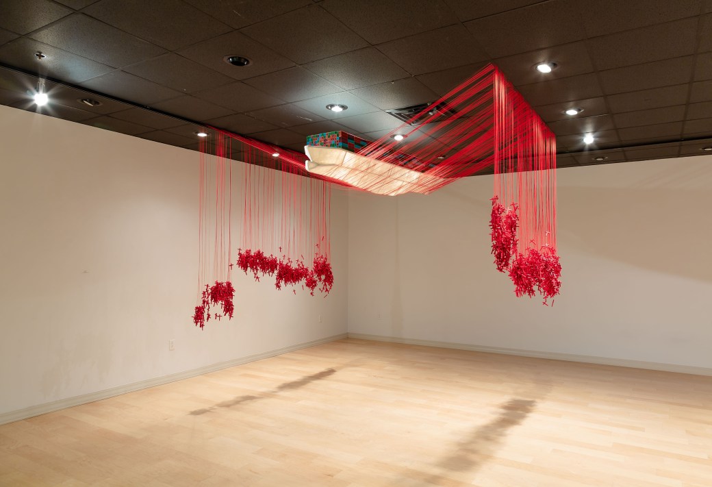 This cargo ship is made from Chinese rice paper and is an exact replica of the largest Chinese container ship- the CSCL Globe. There are over 2000 handmade and hand painted crosses that are being pulled down in order to elevate the container ship. Each one of these crosses represent a church that has been affected by the strong arm of the Chinese government. I am lifting up materials things at the expense of the church.